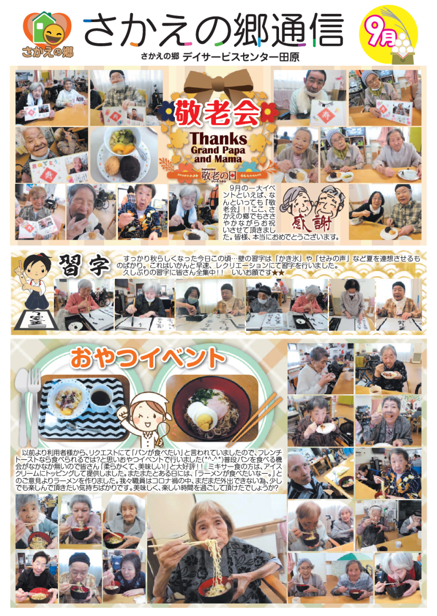 さかえの郷通信9月号 2021/11/02 介護サービスで地域1番を目指すさかえの郷グループの施設だよりを是非ご覧ください。 (豊橋、豊川、田原、蒲郡、岡崎) *施設だよりの画像をクリックで閲覧できます。 R3.9月デイ宿 R3.9月デイ若宮 R3.9月デイ柿の花 R3.9月デイ竜美 R3.9月デイ田原 R3.9月デイ石巻