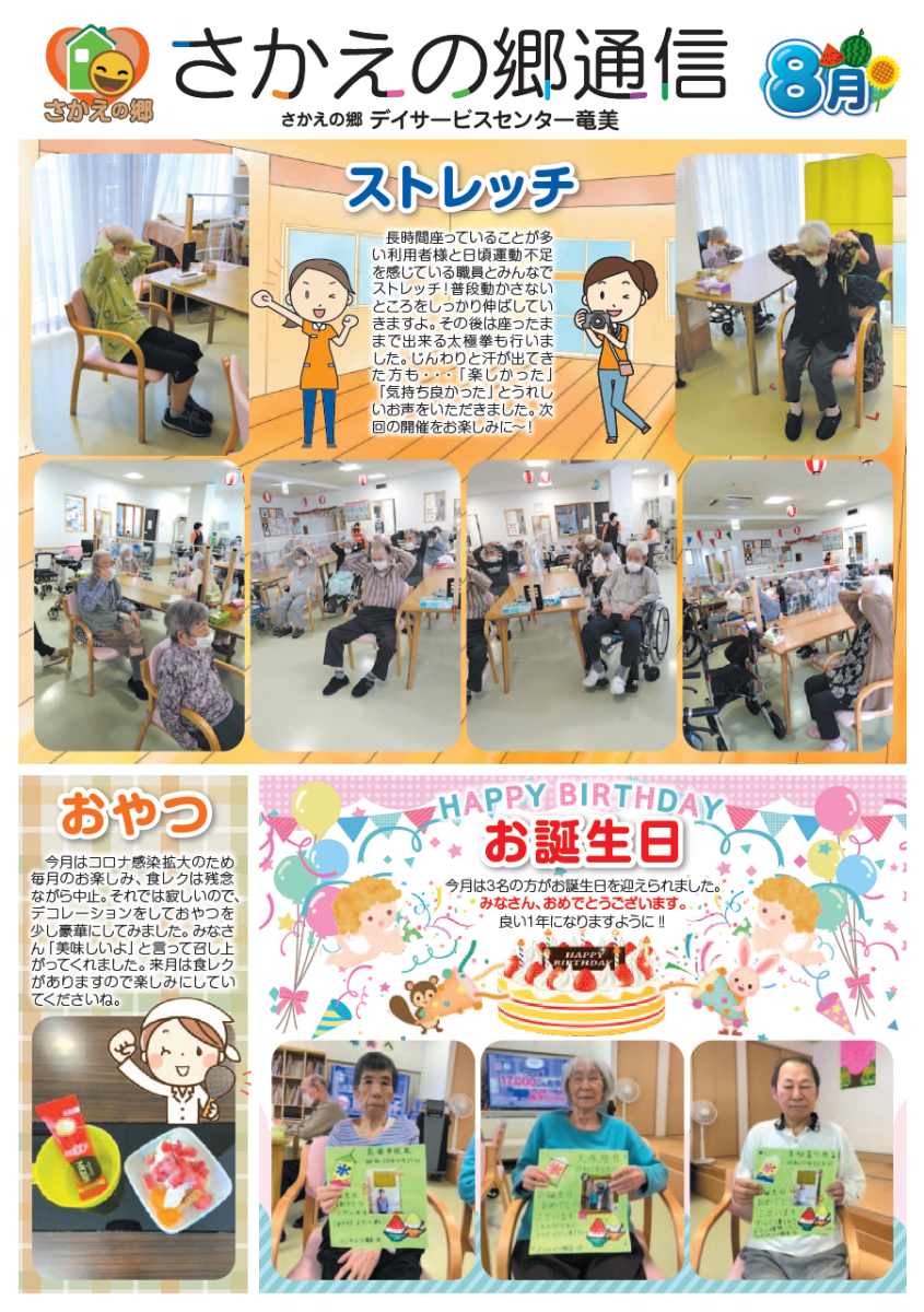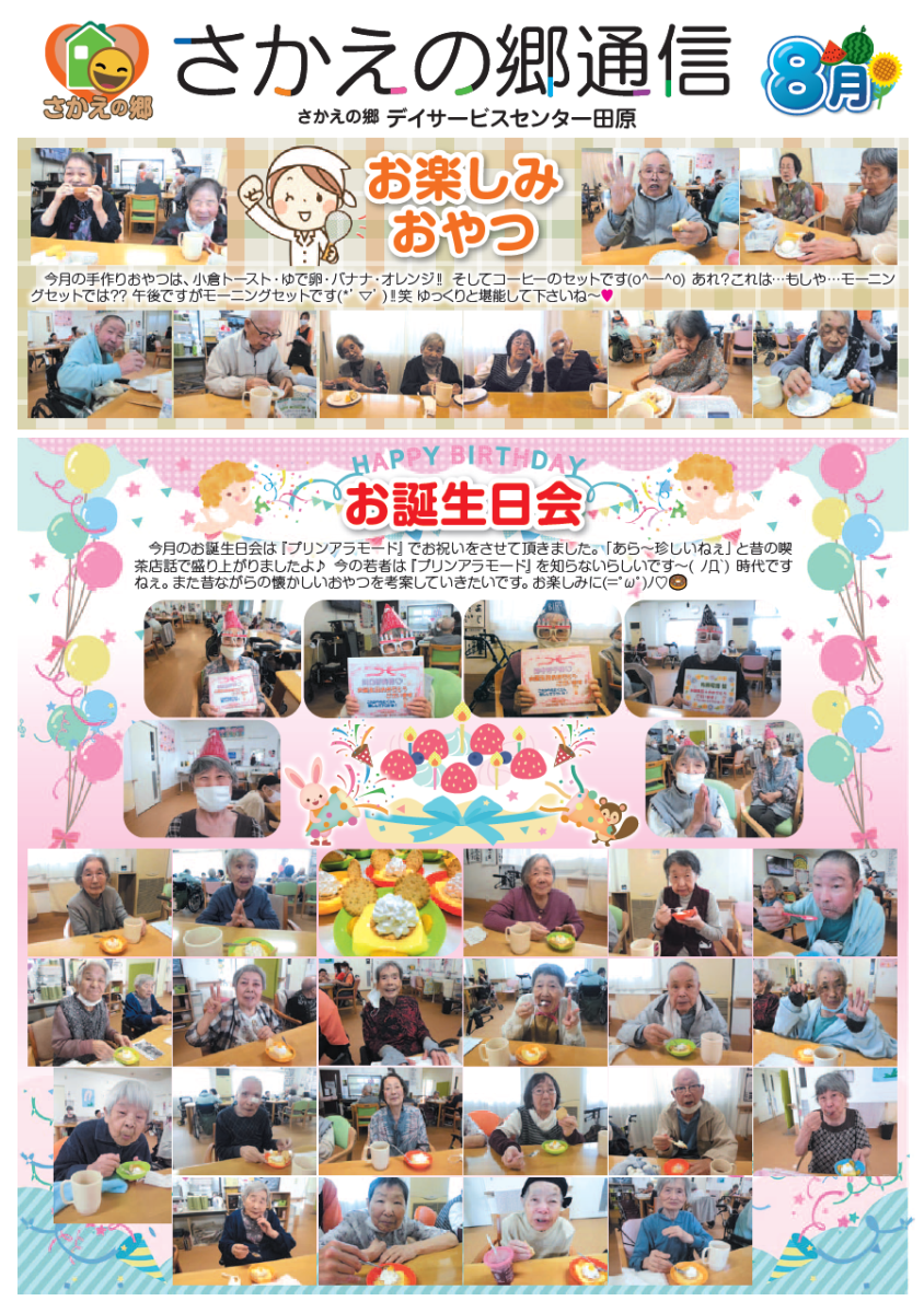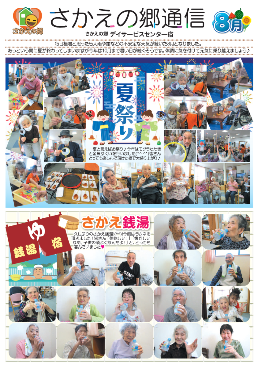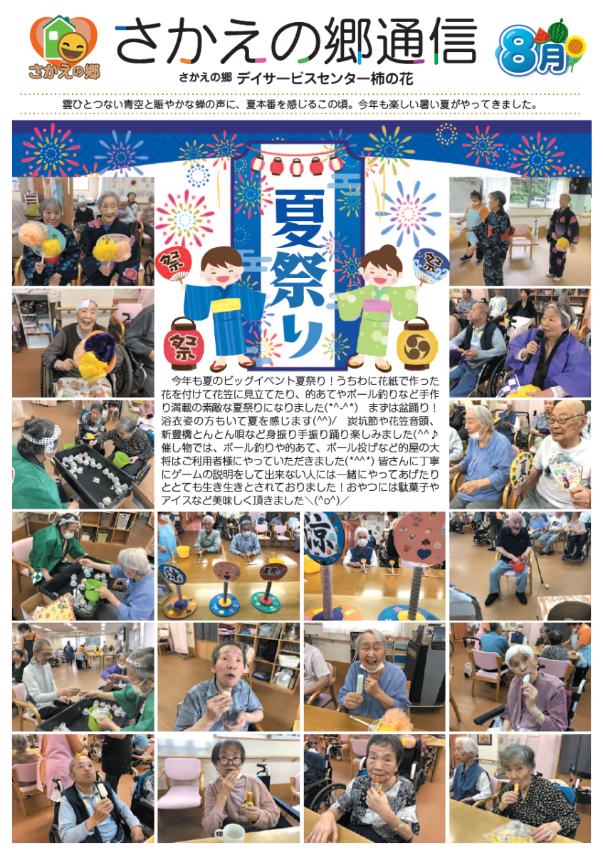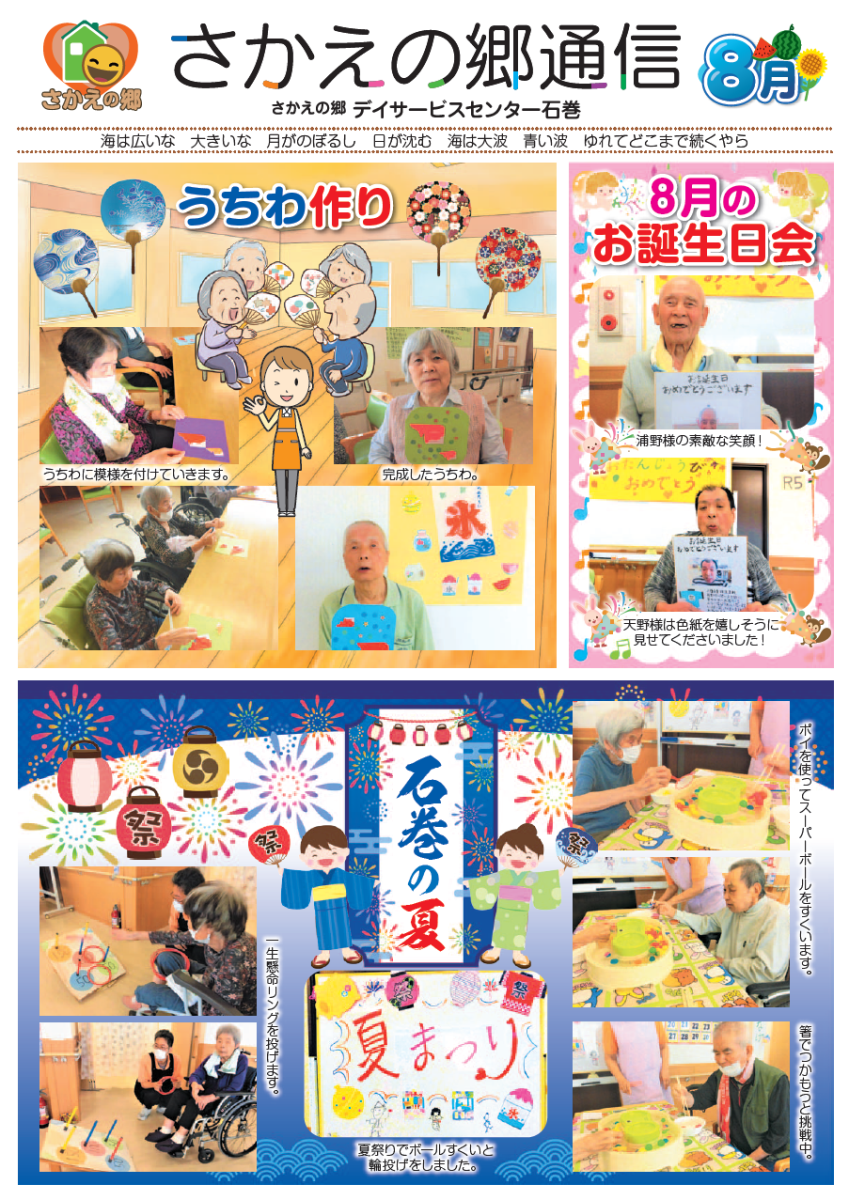 さかえの郷通信2023年8月号 2023/10/04 介護サービスで地域1番を目指すさかえの郷グループの施設だよりを是非ご覧ください。 (若宮、田原、宿、石巻、竜美、柿の花) *施設だよりの画像をクリックで閲覧できます。