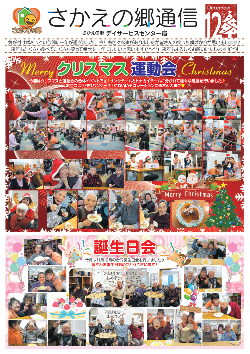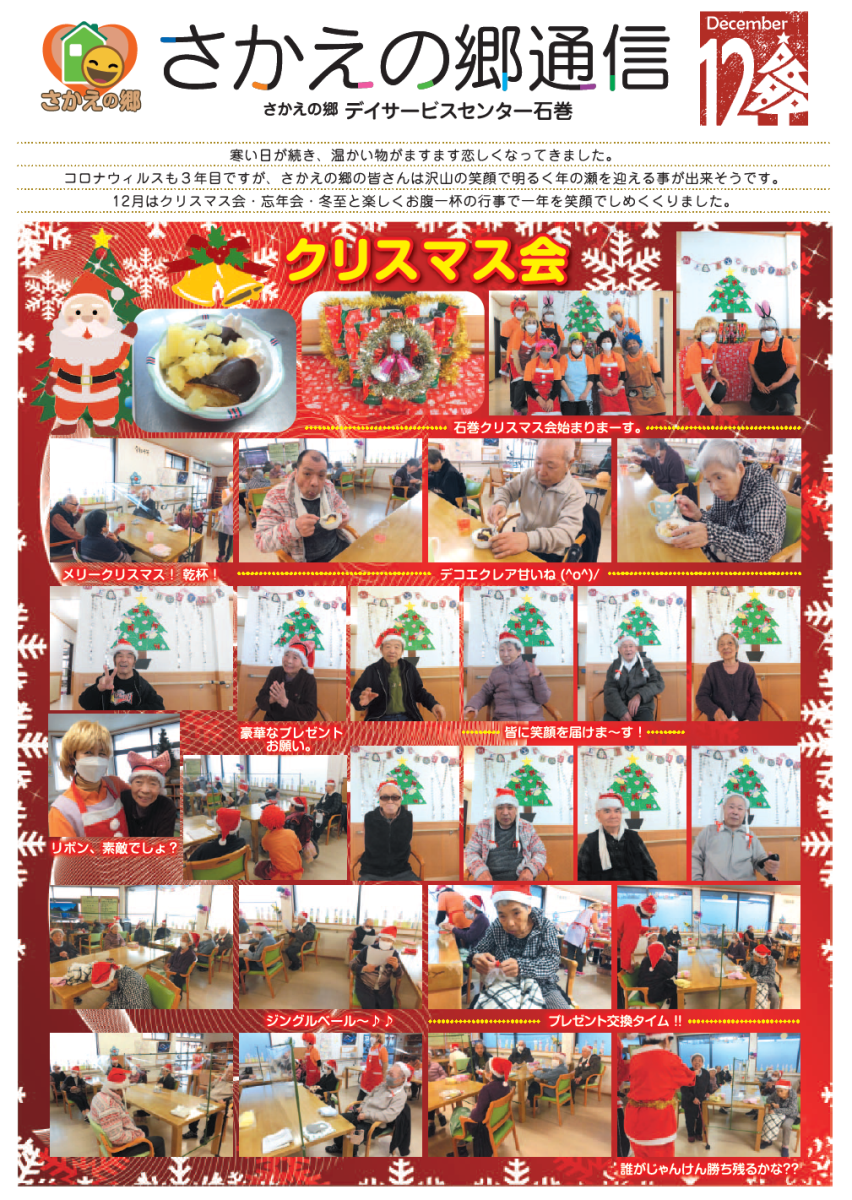さかえの郷通信2022年12月号 2023/02/03 介護サービスで地域1番を目指すさかえの郷グループの施設だよりを是非ご覧ください。 (若宮、田原、宿、石巻、竜美、柿の花) *施設だよりの画像をクリックで閲覧できます。