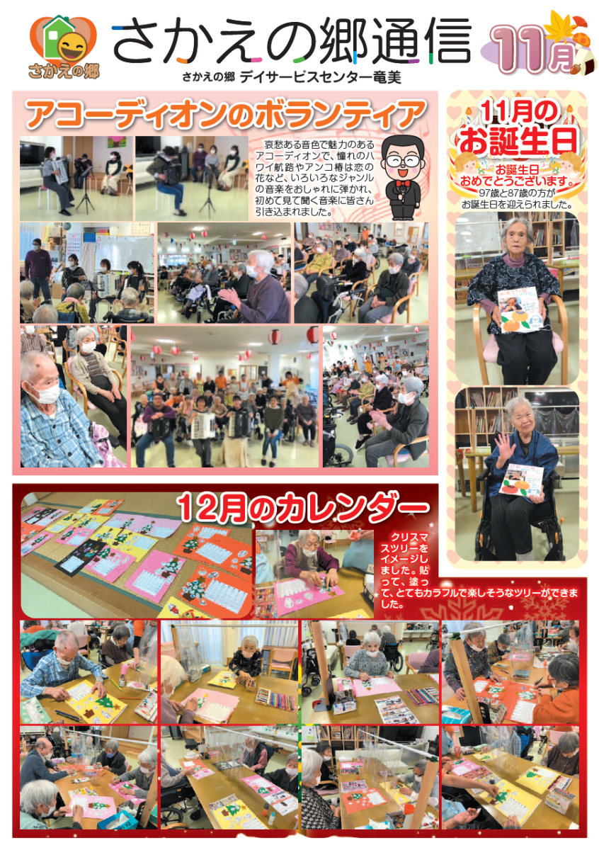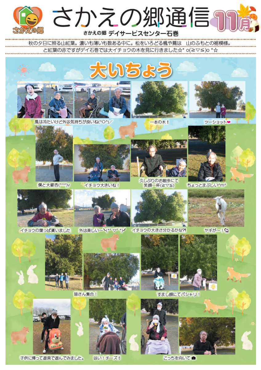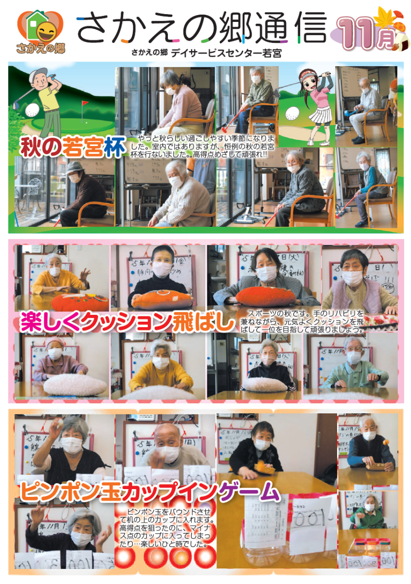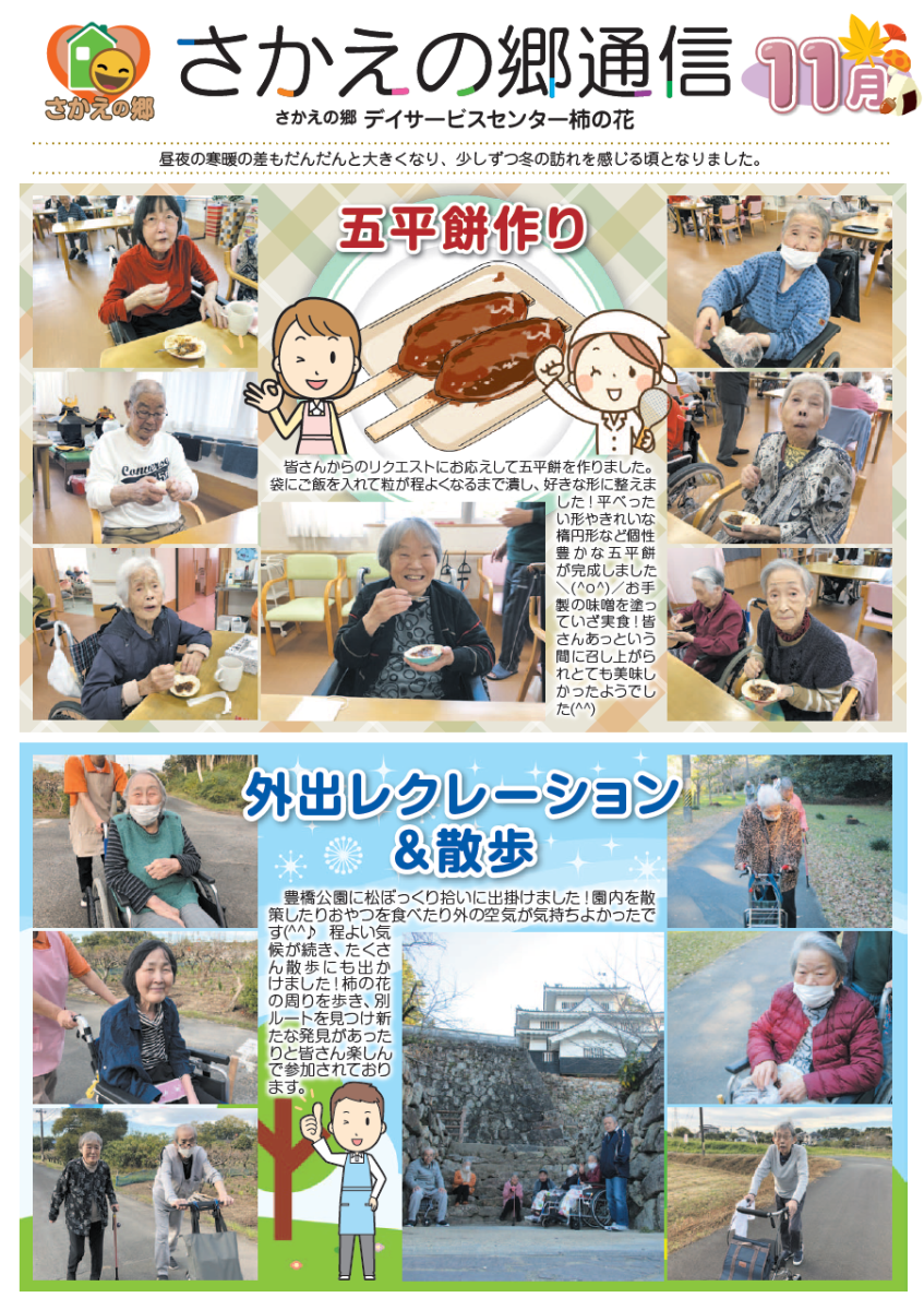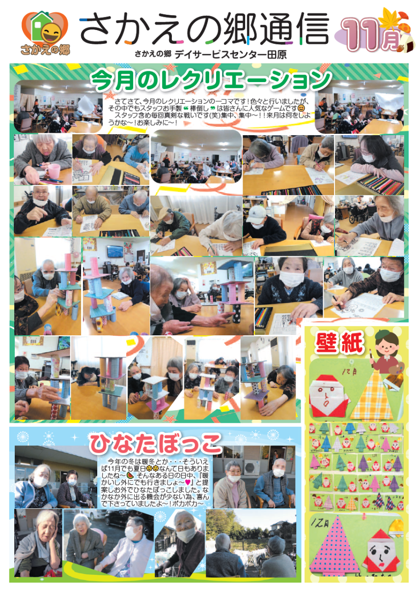 さかえの郷通信2023年11月号 2024/01/04 介護サービスで地域1番を目指すさかえの郷グループの施設だよりを是非ご覧ください。 (若宮、田原、宿、石巻、竜美、柿の花) *施設だよりの画像をクリックで閲覧できます。