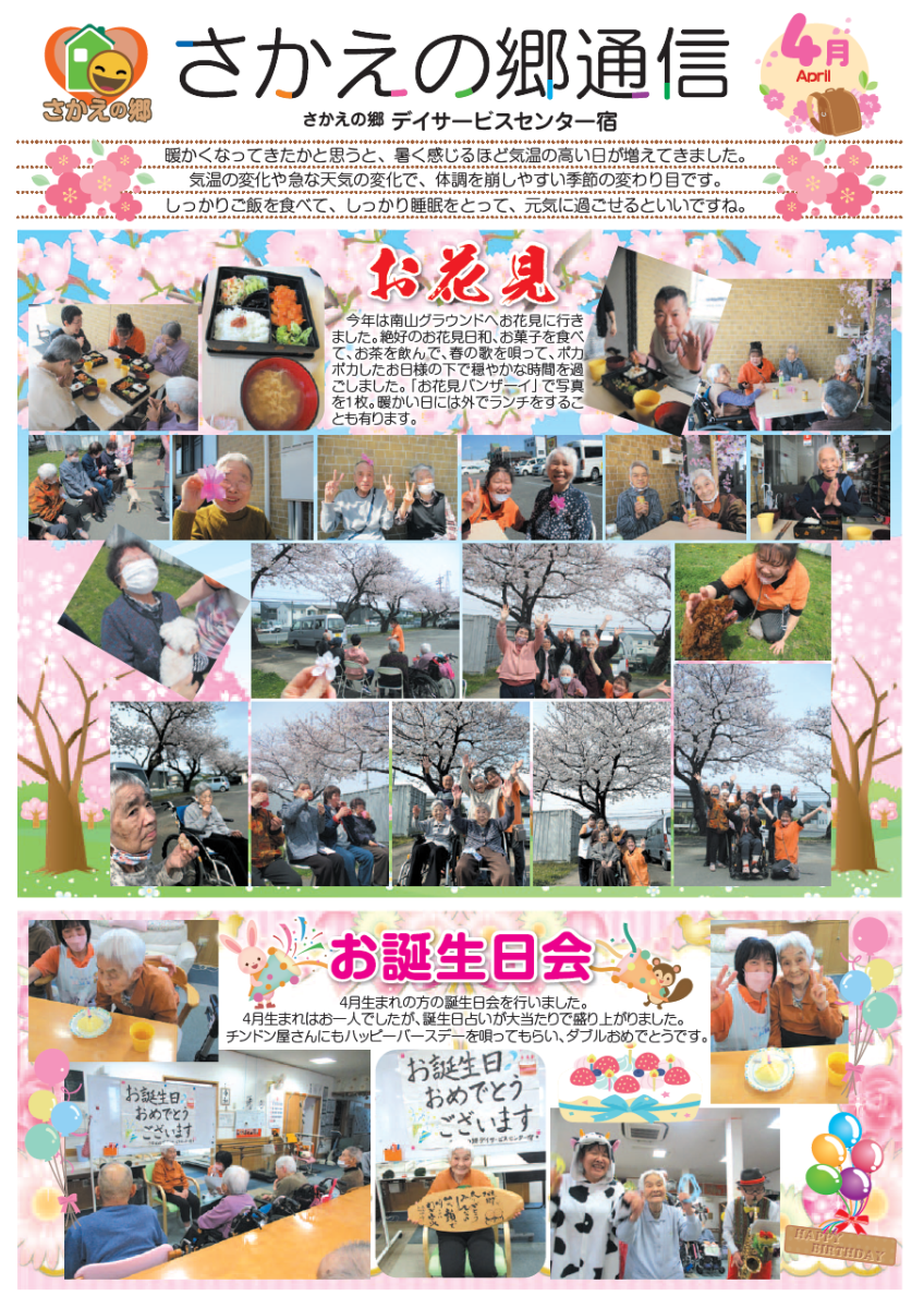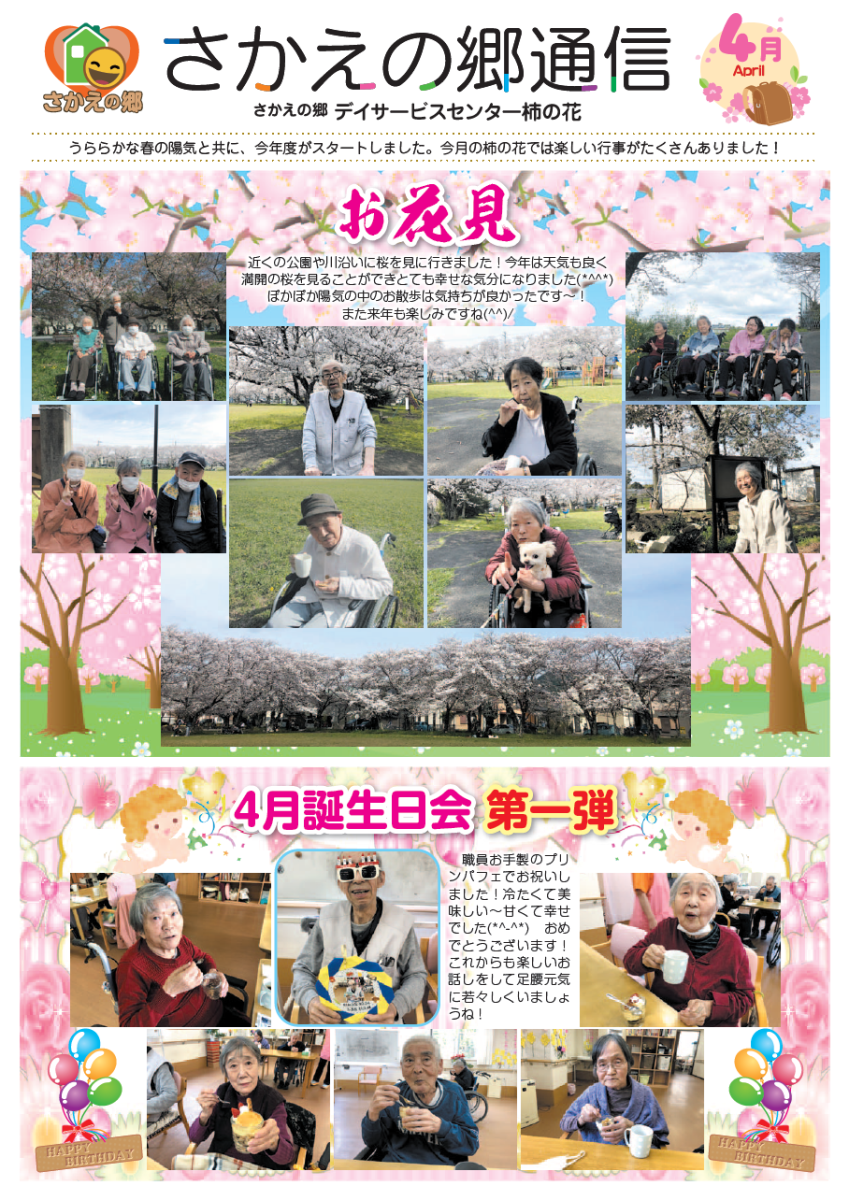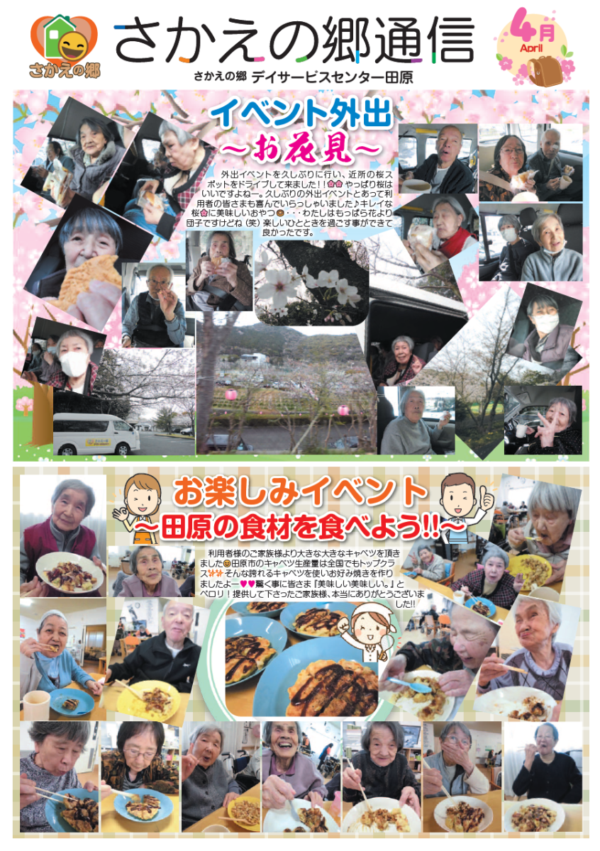 さかえの郷通信2024年4月号 2024/06/05 介護サービスで地域1番を目指すさかえの郷グループの施設だよりを是非ご覧ください。 (若宮、田原、宿、石巻、竜美、柿の花) *施設だよりの画像をクリックで閲覧できます。