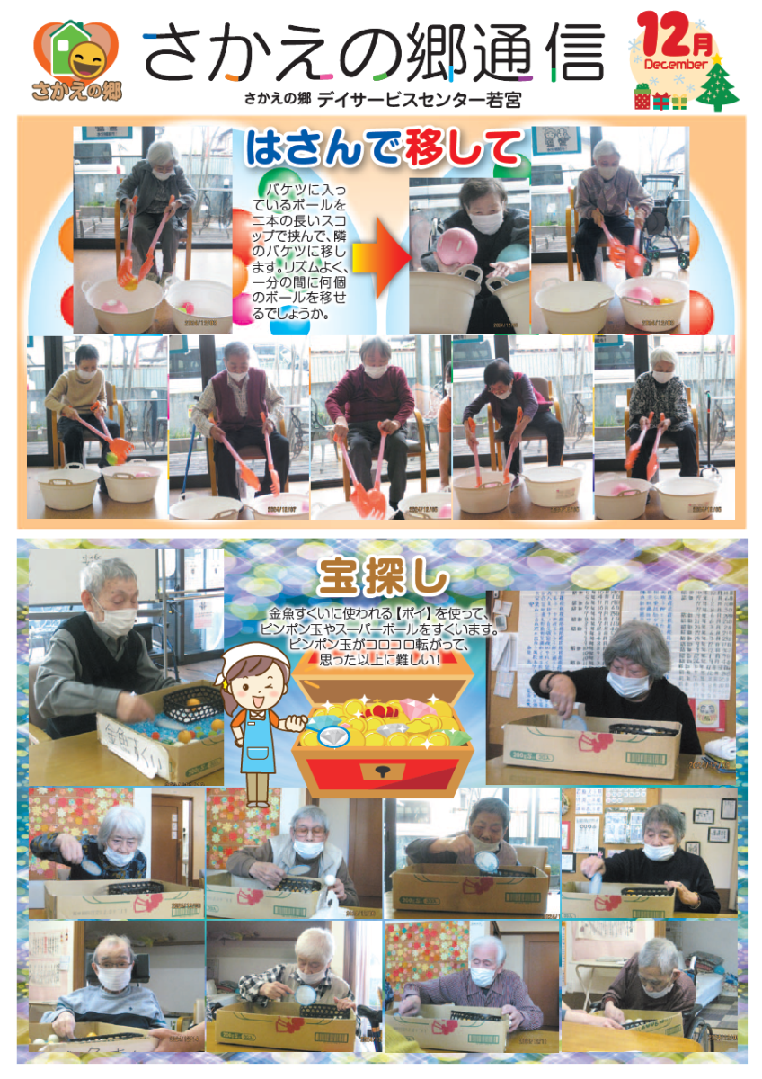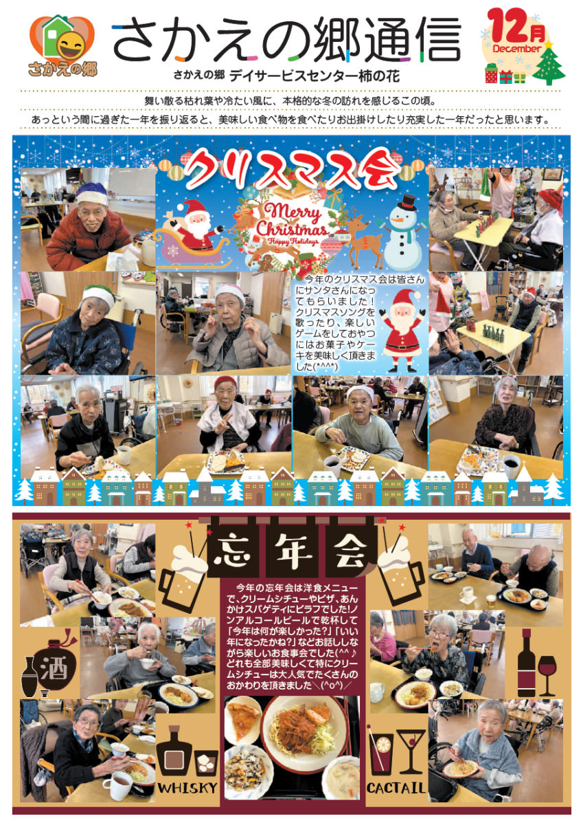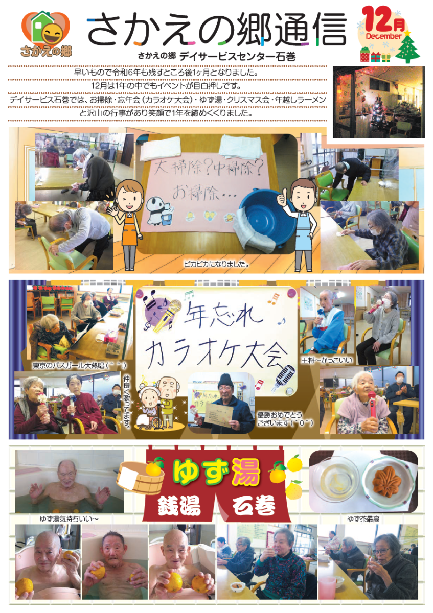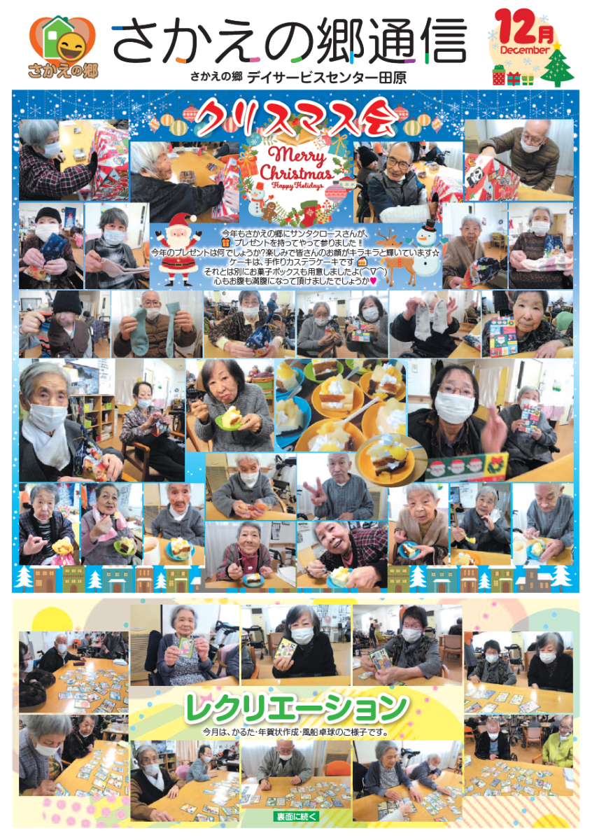さかえの郷通信2024年12月号 2025/02/04 介護サービスで地域1番を目指すさかえの郷グループの施設だよりを是非ご覧ください。 (若宮、田原、宿、石巻、竜美、柿の花) *施設だよりの画像をクリックで閲覧できます。 施設ページに動画も掲載していますのでご覧ください。