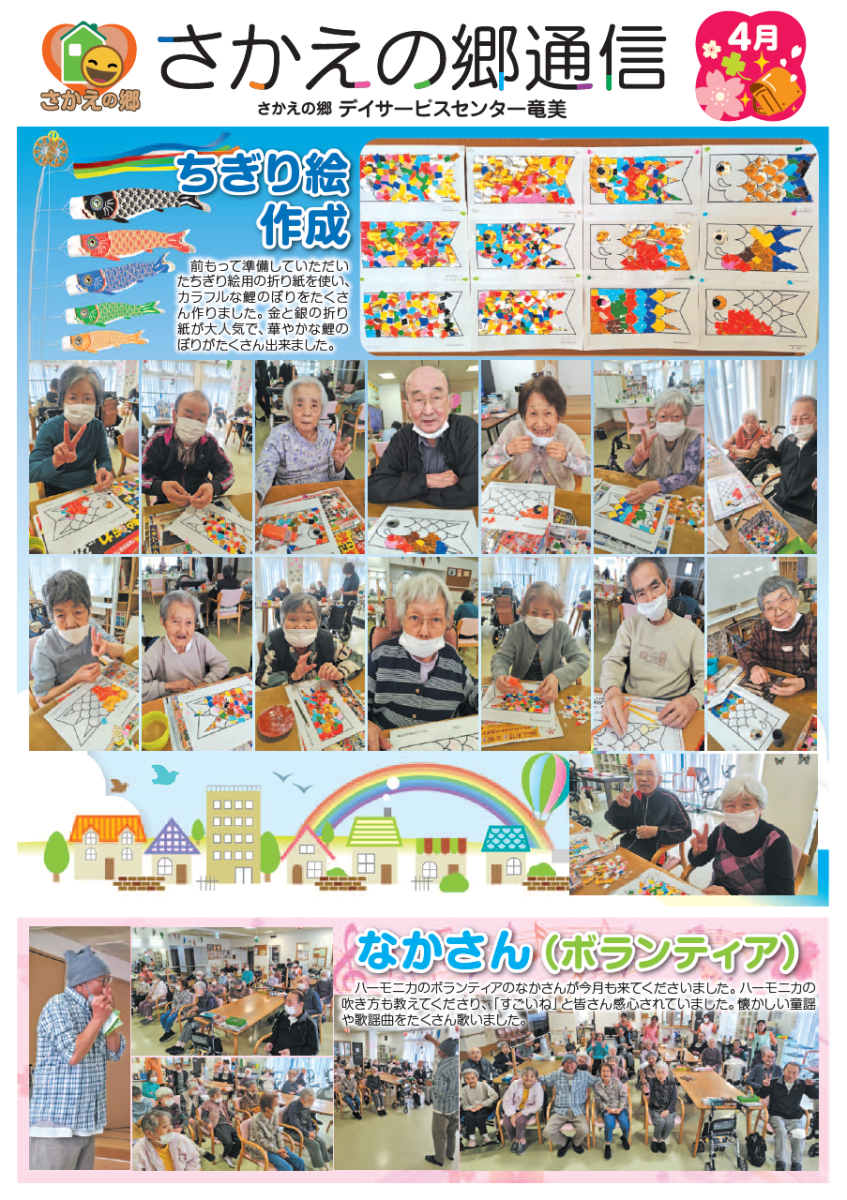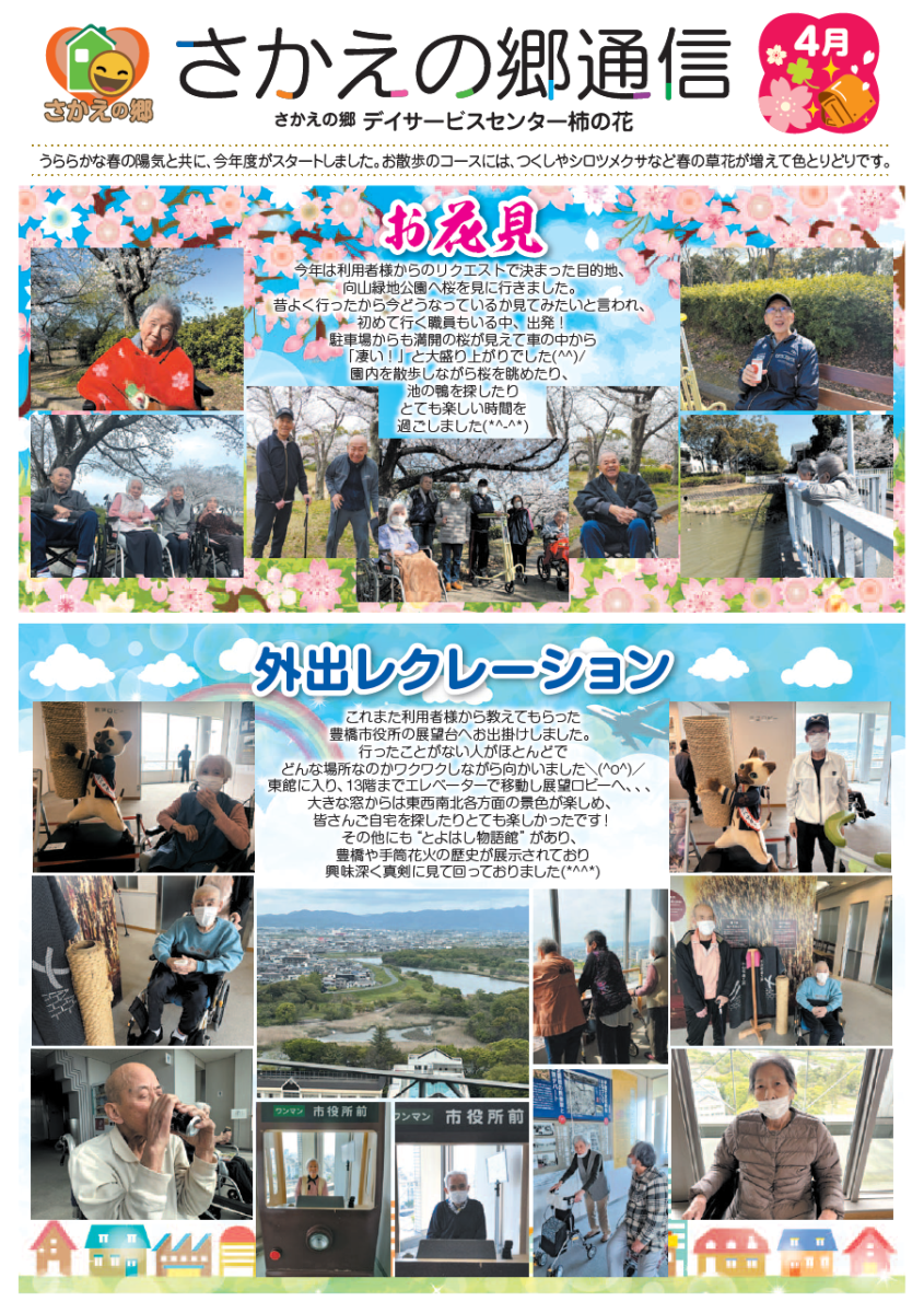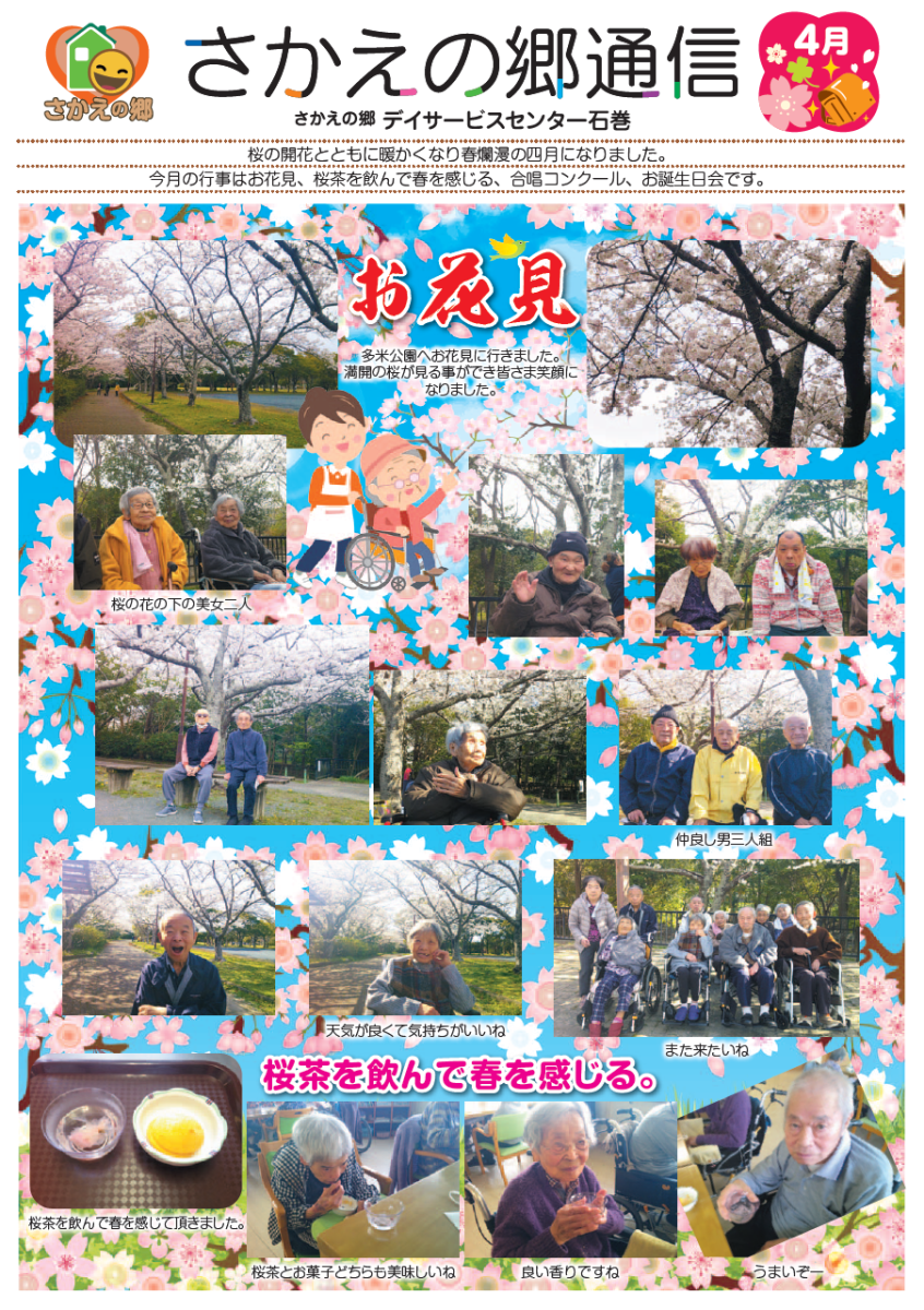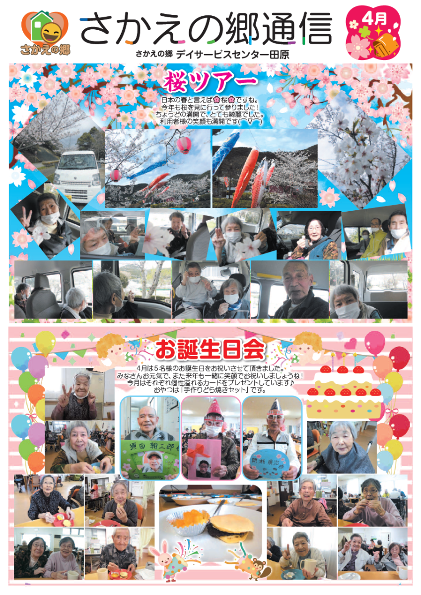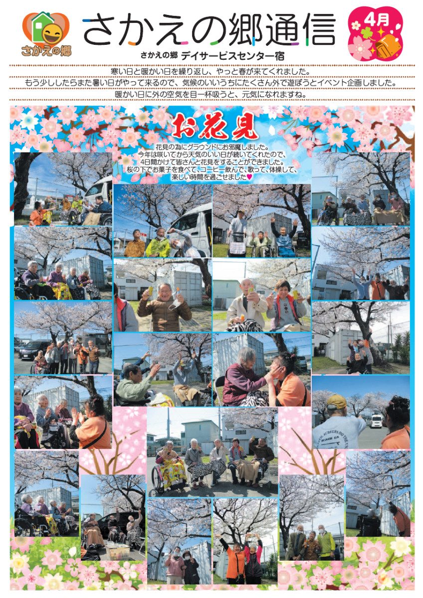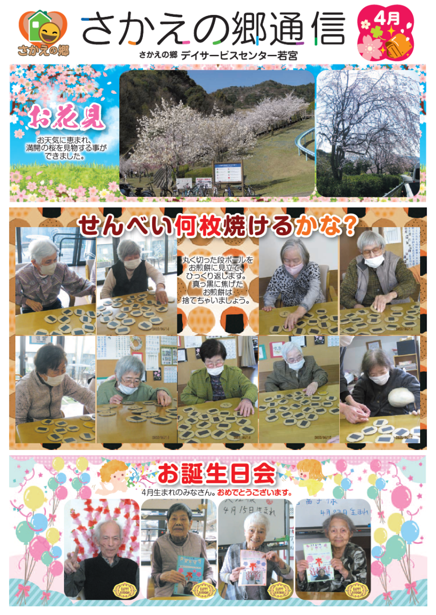 さかえの郷通信2025年4月号 2025/06/05 介護サービスで地域1番を目指すさかえの郷グループの施設だよりを是非ご覧ください。 (若宮、田原、宿、石巻、竜美、柿の花) *施設だよりの画像をクリックで閲覧できます。 施設ページに動画も掲載していますのでご覧ください。