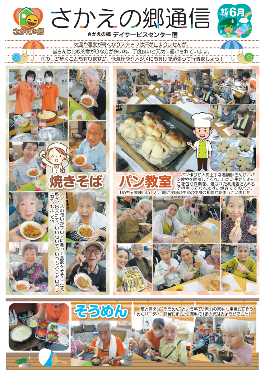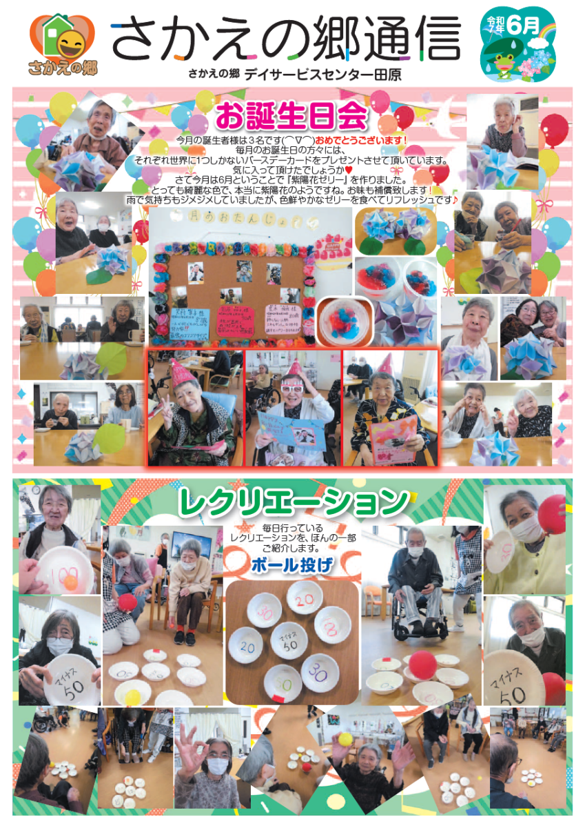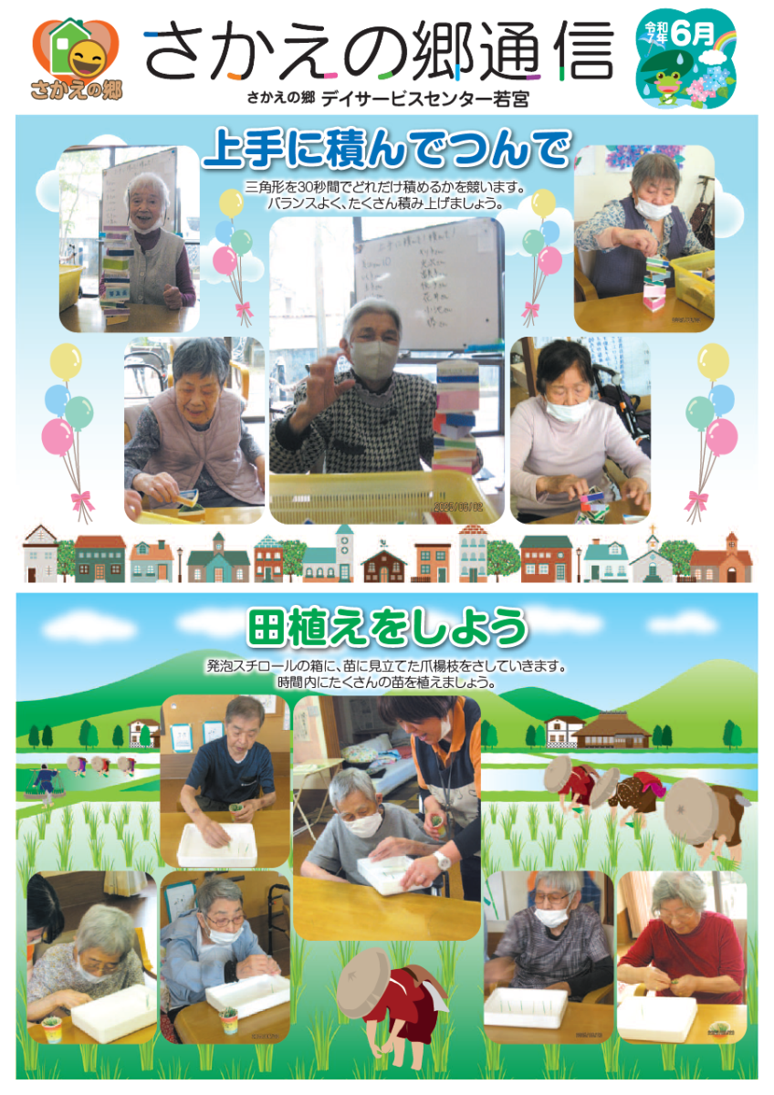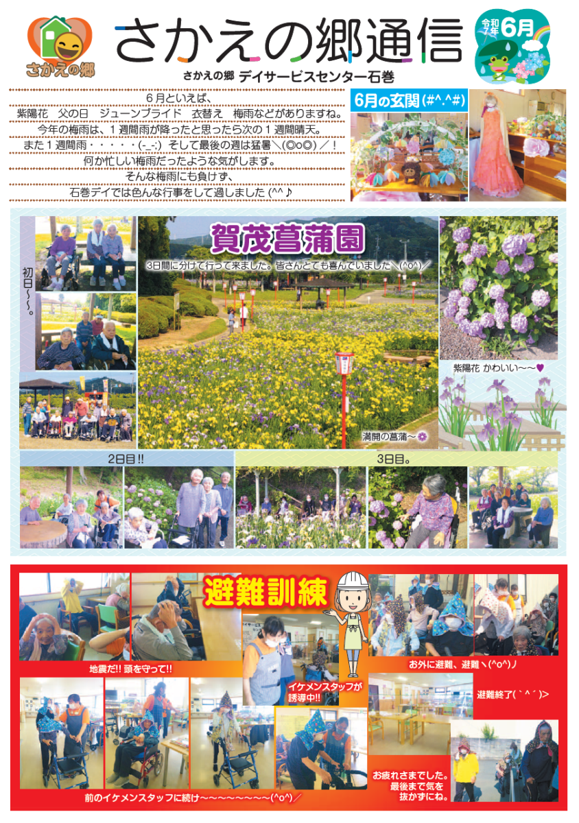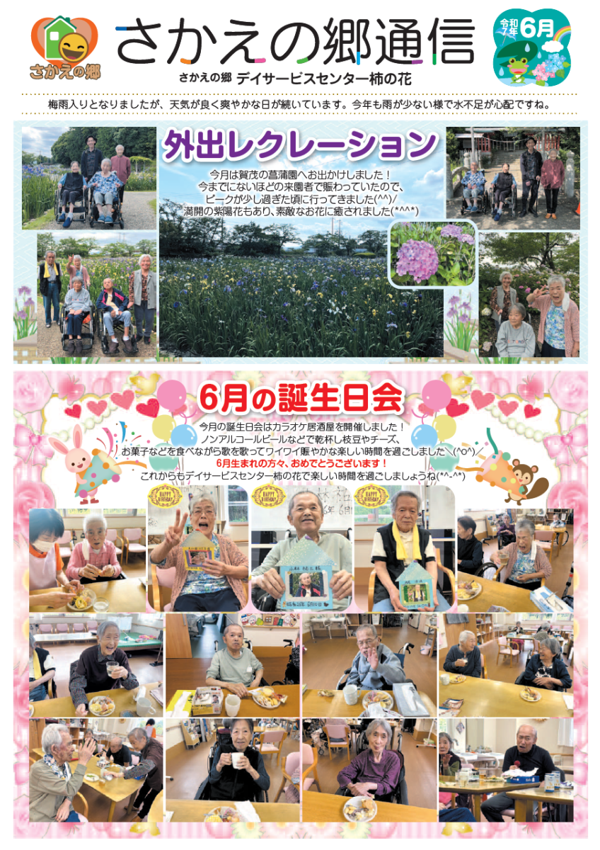さかえの郷通信2025年6月号 2025/08/04 介護サービスで地域1番を目指すさかえの郷グループの施設だよりを是非ご覧ください。 (若宮、田原、宿、石巻、竜美、柿の花) *施設だよりの画像をクリックで閲覧できます。 施設ページに動画も掲載していますのでご覧ください。
