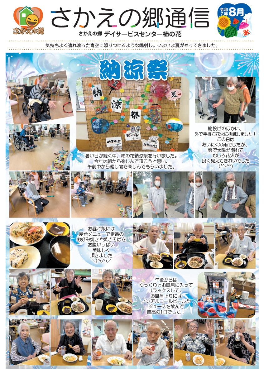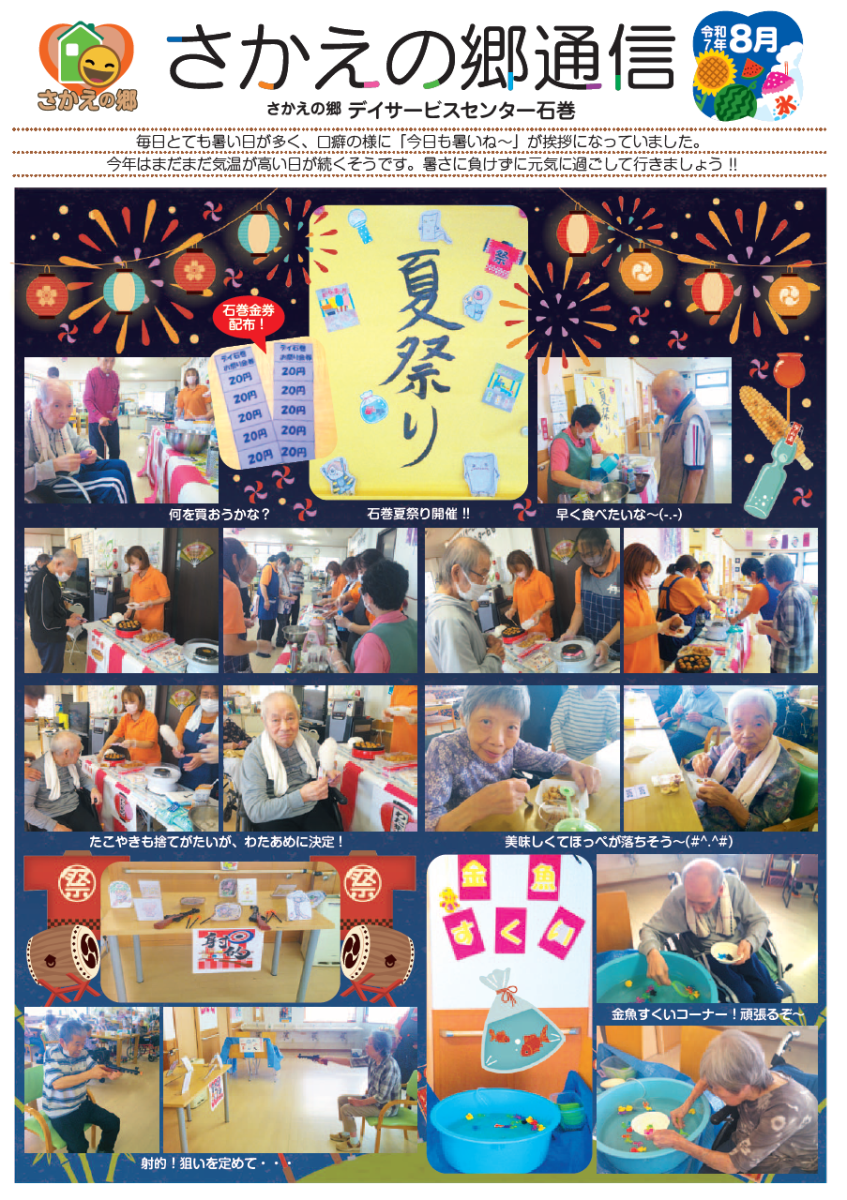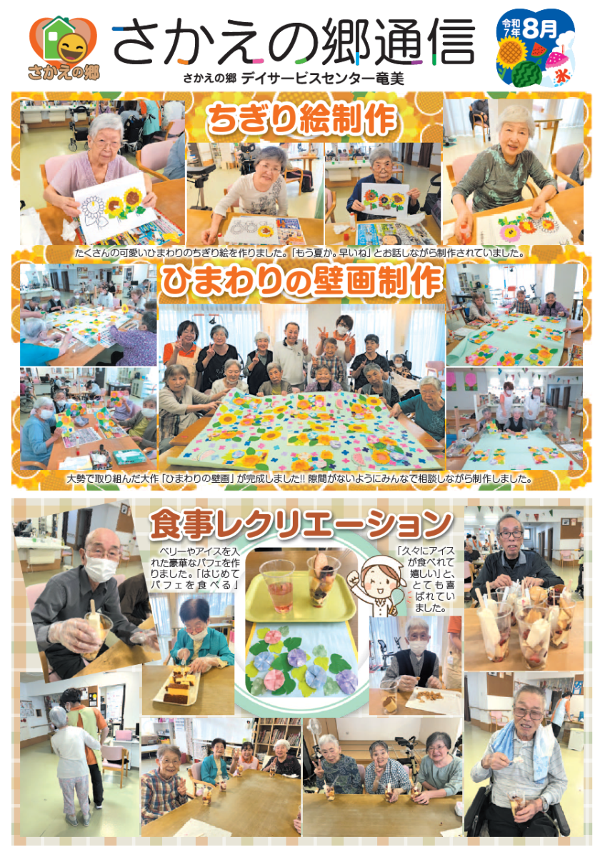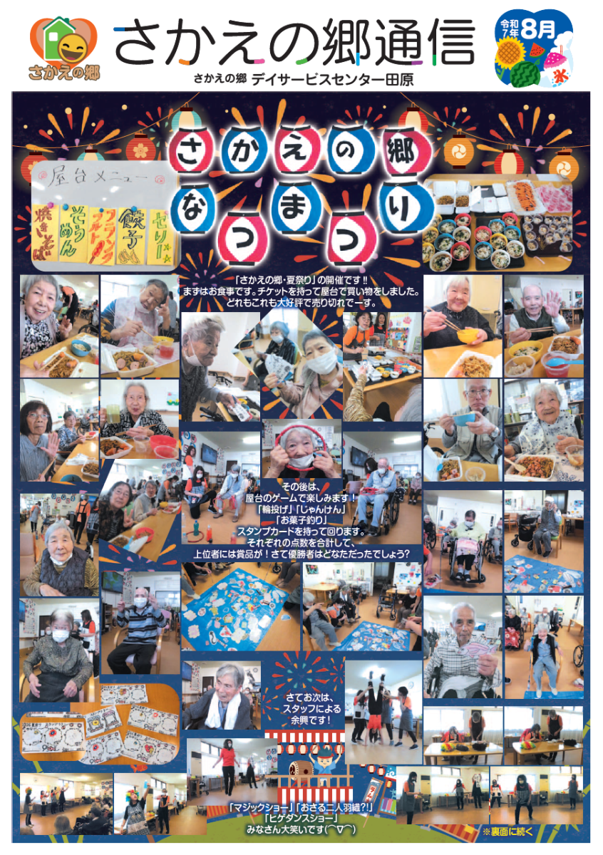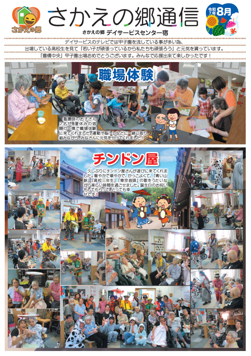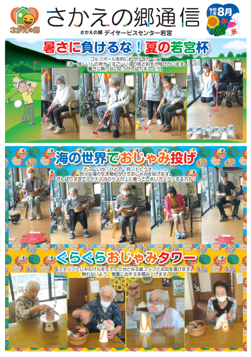 さかえの郷通信2025年8月号 2025/10/02 介護サービスで地域1番を目指すさかえの郷グループの施設だよりを是非ご覧ください。 (若宮、田原、宿、石巻、竜美、柿の花) *施設だよりの画像をクリックで閲覧できます。 施設ページに動画も掲載していますのでご覧ください。