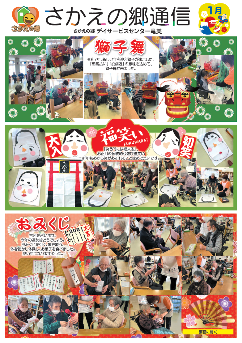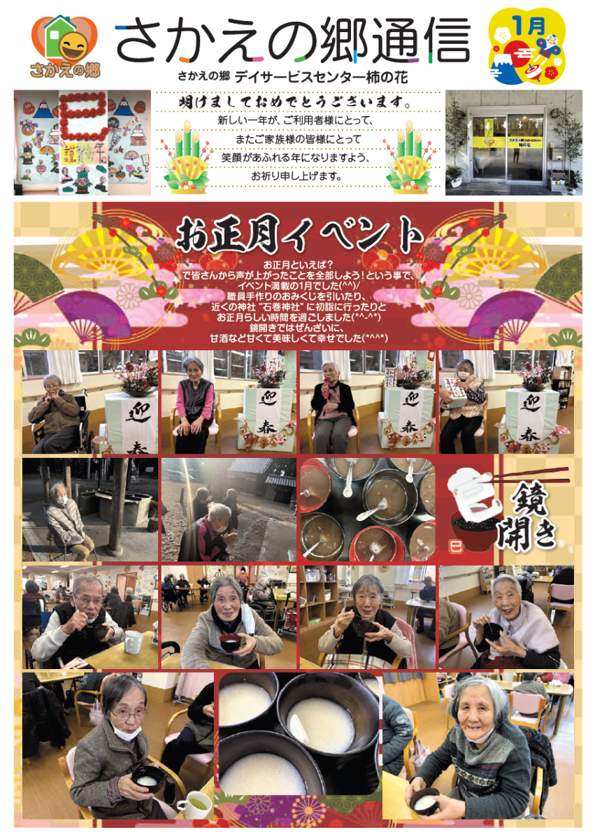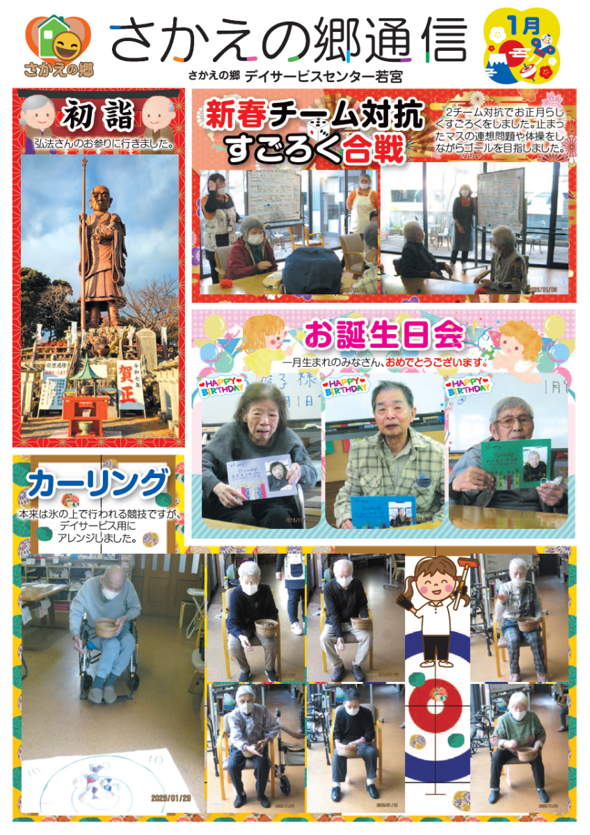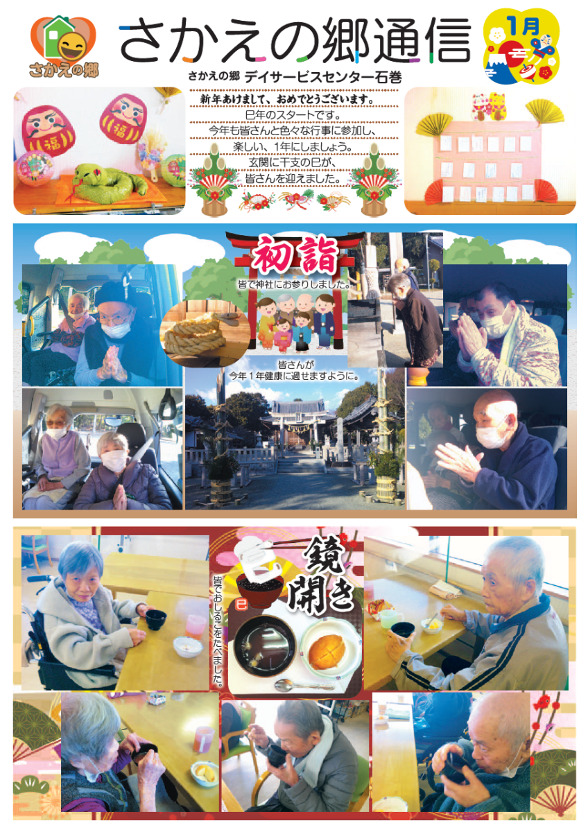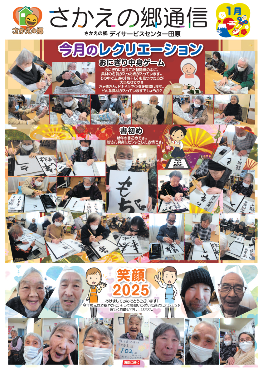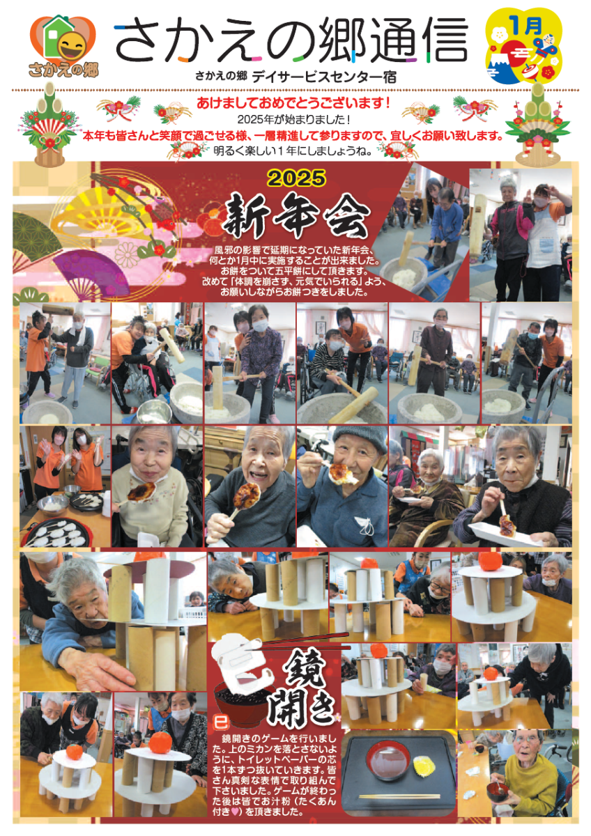 さかえの郷通信2025年1月号 2025/03/04 介護サービスで地域1番を目指すさかえの郷グループの施設だよりを是非ご覧ください。 (若宮、田原、宿、石巻、竜美、柿の花) *施設だよりの画像をクリックで閲覧できます。 施設ページに動画も掲載していますのでご覧ください。