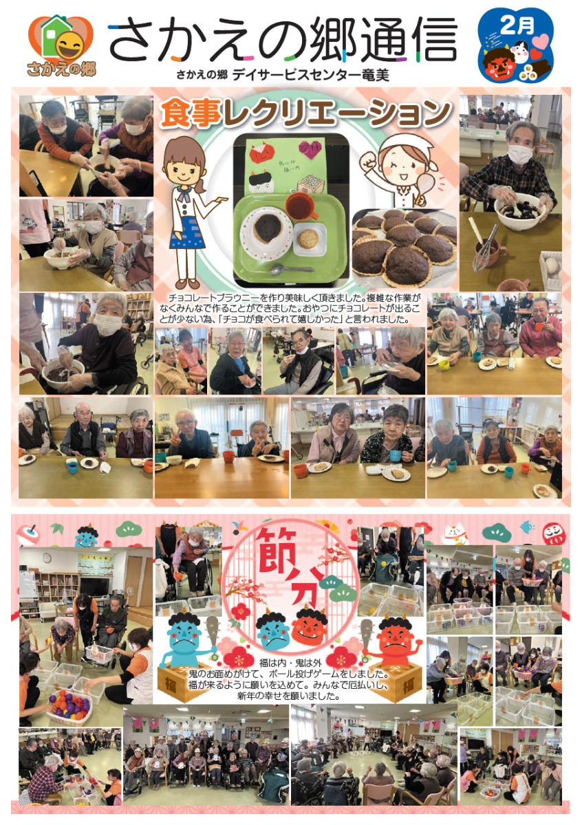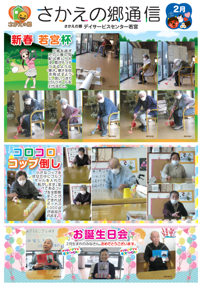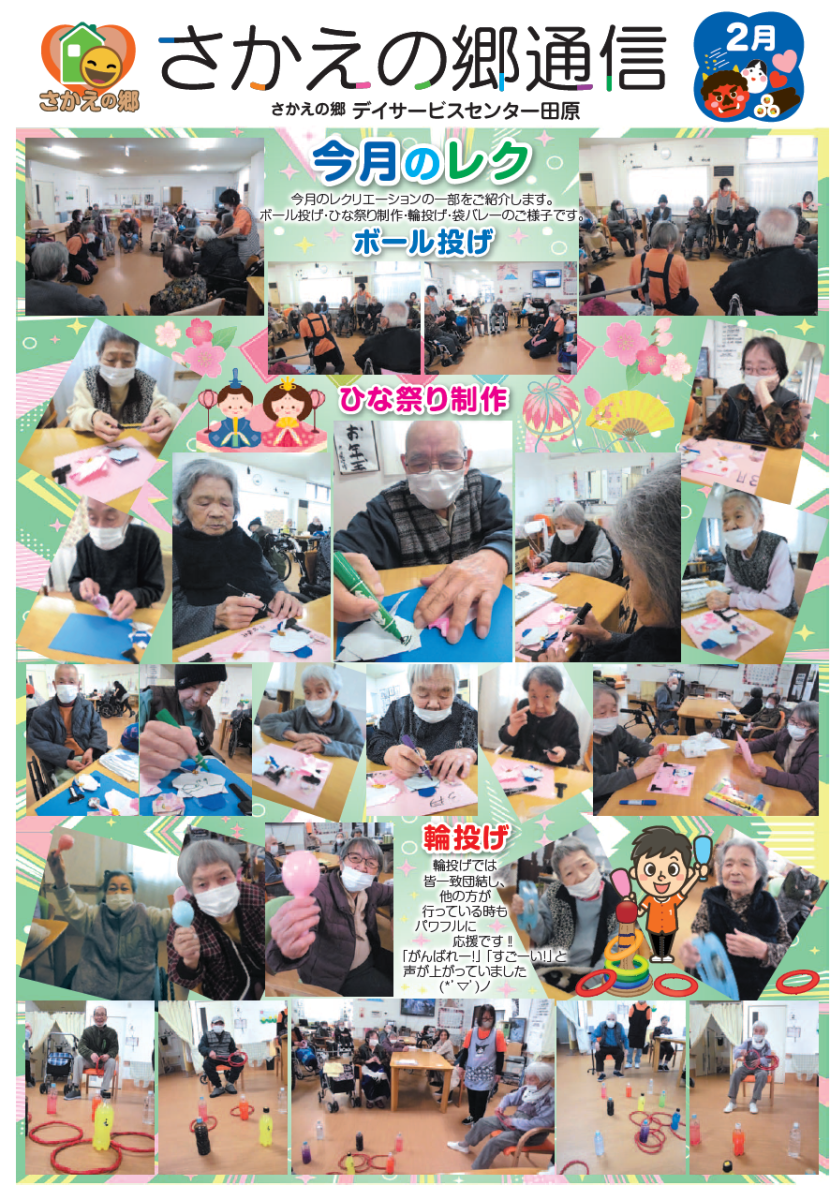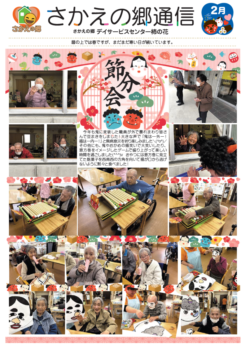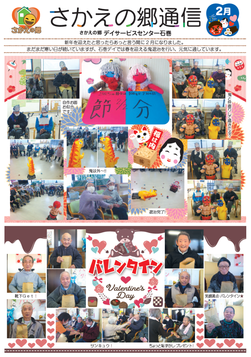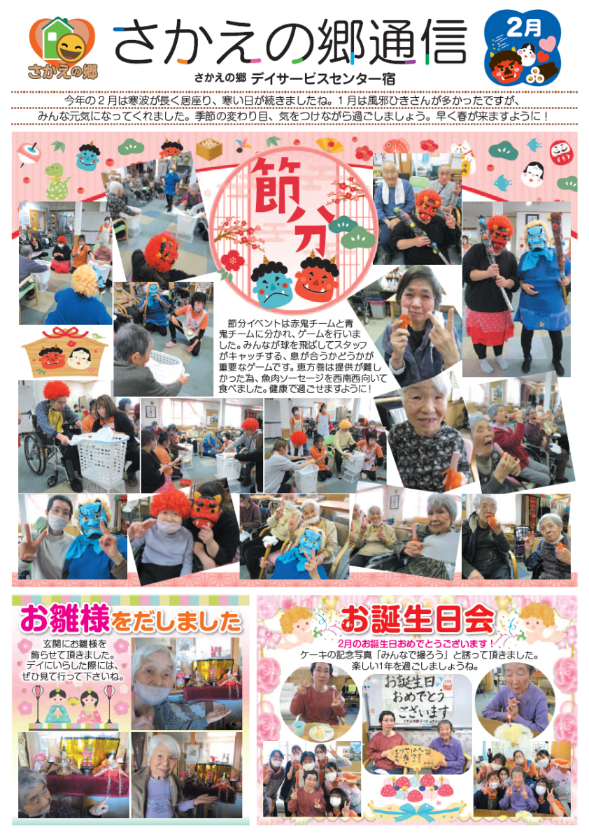 さかえの郷通信2025年2月号 2025/04/03 介護サービスで地域1番を目指すさかえの郷グループの施設だよりを是非ご覧ください。 (若宮、田原、宿、石巻、竜美、柿の花) *施設だよりの画像をクリックで閲覧できます。 施設ページに動画も掲載していますのでご覧ください。